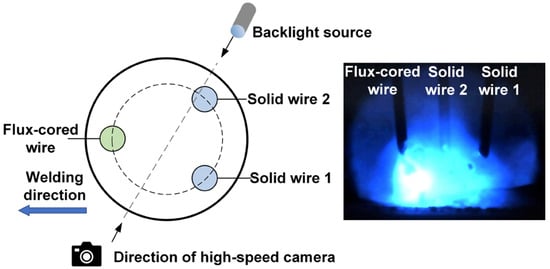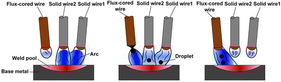 As mentioned in the studies above, the majority of the welding processes for HSS and UHSS employ a single fluxed-cored wire. Despite the excellent joint performance achieved through flux-cored wire welding, there are limitations to further enhancing welding efficiency []. Therefore, this paper proposes a novel hybrid welding process for UHSS that could achieve superior weld quality and higher welding efficiency, i.e., the multiple solid-flux cored wires arc hybrid welding process. This process integrates three wires arranged in an equilateral triangle configuration into the same welding gun. Within this arrangement, the front-leading wires are two solid wires, while the following wire is flux-cored wire. By optimizing the alloying composition of the flux-cored wire, it is feasible to enhance the mechanical properties of the welded joint. Through the simultaneous arcing of the three wires during welding, a significant improvement in welding efficiency can be achieved. This process would unleash novel possibilities for high-quality and efficient welding of UHSS.