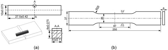 Dimensions of specimens for mechanical property test: (a) impact specimen and (b) tensile specimen.
