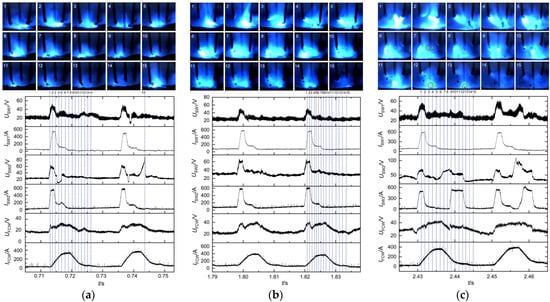 Electrical signals and high-speed photographs at different preset voltages: (a) preset voltage of 22 V, (b) preset voltage of 26 V, and (c) preset voltage of 30 V.
