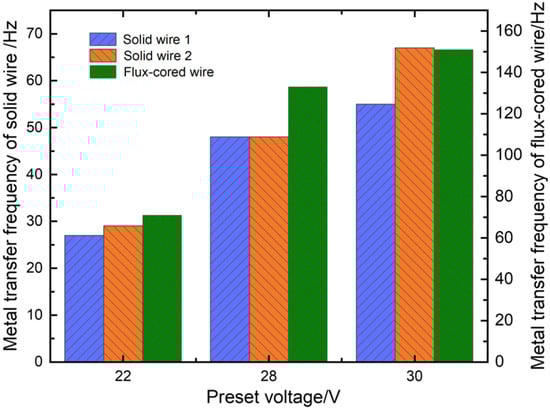 The arc lengths increased proportionally with the increase in arc voltage to 26 V, and short-circuiting transfer ceased to occur, as shown in Figure 6b. In addition, the electrical signals exhibited increased regularity, and the welding process kept smooth and stable metal transfers of one droplet per pulse for solid wires and multiple droplets per pulse for flux-cored wires. When the preset voltage increased to 30 V, solid wire 2 generated metal transfer of one droplet multiple pulses, as illustrated in Figure 6c. Initially, solid wire 1 and the flux-cored wire accomplished metal transfer during the first pulse period. However, a droplet consistently remained at the end of solid wire 2 (indicated by a red circle in image 7). The droplet did not detach from the end of solid wire 2 and transfer to the weld pool until the second pulse period (indicated by red circles in images 12 and 13). Furthermore, as the arc lengths significantly increased, the arc deflections towards each other became more pronounced, which led to more intense interference among arcs. Consequently, abnormal arc ignition frequently occurred and even caused the streaming transfer, such as solid wire 2. The abnormal arc ignition would reduce welding stability. As illustrated in Figure 7, the metal transfer frequencies of the three wires increased with the increase in preset voltage. This was because the pulse frequency increased, and short-circuiting transfer also disappeared as the arc length increased. Furthermore, the flux-cored wire had the highest transfer frequency due to its easy melting, followed by the solid wires.