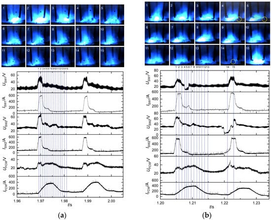 Electrical signals and high-speed photographs at different preset currents: (a) preset current of 160 A and (b) preset current of 180 A.