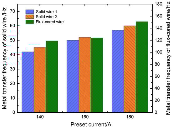 The experiment employed a preset voltage of 26 V, corresponding to respective preset currents of 140 A, 160 A, and 180 A. Three welding power sources kept the same preset parameters. The detailed metal transfer process at a preset current of 140 A is illustrated in Figure 6b. The whole welding process remained relatively stable at preset currents of 140 A and 160 A. Both solid wires 1 and 2 exhibited a metal transfer mode of one droplet per pulse, while the flux-cored wire demonstrated a metal transfer mode of multiple droplets per pulse. When the preset current increased to 180 A, short-circuiting transfer occurred at the end of solid wire 1, as indicated by the yellow circles in Figure 8b, which led to poorer welding stability. In addition, the metal transfer frequencies of the three wires exhibited an upward trend as the preset current increased, as illustrated in Figure 9. Welding current directly determined pulse frequency; therefore, an increase in preset current resulted in a significant increase in transfer frequency.