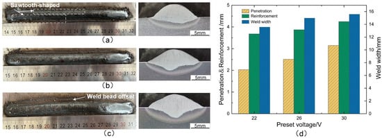 Effect of different preset voltages on weld formation: (a) preset voltage of 22 V, (b) preset voltage of 26 V, (c) preset voltage of 30 V, and (d) weld size.