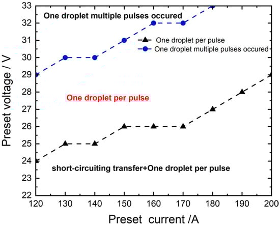 The metal transfer and arc behavior, particularly for solid wires, were significantly influenced by both the preset current and voltage, thereby subsequently impacting the weld formation. The optimal parameter window for the welding process was obtained based on the analysis above, as illustrated in Figure 13. The flux-cored wire maintained multiple droplets per pulse due to its easily meltable properties. When the preset voltage was lower, i.e., the shorter arc, the droplets at wire ends were prone to contacting the weld pool to form a short-circuiting transfer, and the frequency of short-circuiting transfer decreased with increasing preset voltage. Furthermore, short-circuiting transfer would lead to poorer welding stability, thereby affecting the final weld formation. The metal transfer mode transitioned into one droplet per pulse with an increase in preset voltage, which was the desired metal transfer mode. When the preset voltage gradually increased until it reached a certain threshold, the one droplet multiple pulses started to occur in the welding process, and interference among arcs became more intense. Consequently, abnormal arc ignition frequently occurred, resulting in decreased welding stability and weld offset. In addition, when the preset current was higher, it also led to short-circuiting transfer but with a faster frequency of metal transfer. In conclusion, the optimal parameter window was identified as matching the electrical parameters corresponding to one droplet per pulse. The welding process could achieve excellent welding stability and produce better weld formations within this parameter window.