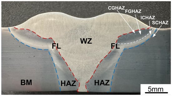 The cross-sectional profile of the joint at 140 A and 26 V is illustrated in Figure 14. The welded joint was fully penetrated without any macroscopic defects such as cracks, incomplete fusion, or porosity. The welded joint can be divided into three regions: the weld zone (WZ), the heat-affected zone (HAZ), and the base metal (BM). Additionally, the HAZ can be further divided into sub-zones: the coarse-grained HAZ (CGHAZ) closest to the fusion line (FL), the fine-grained HAZ (FGHAZ), the intercritical HAZ (ICHAZ), and the sub-critical HAZ (SCHAZ). Among these sub-zones, the ICHAZ experienced the highest peak temperature, which caused an increased grain size in this region.