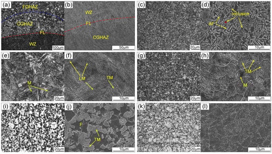 Microstructures observed via OM and SEM in different sub-zones for the upper part of the joint: (a,b) evolution within each subzone, (c,d) weld zone (WZ), (e,f) coarse-grained HAZ (CGHAZ), (g,h) fine-grained HAZ (FGHAZ), (i,j) intercritical HAZ (ICHAZ), and (k,l) subcritical HAZ (SCHAZ).