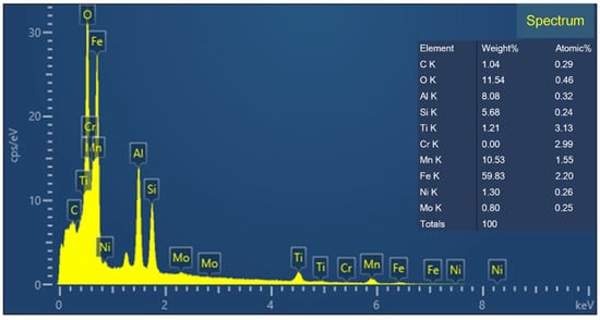 The microstructures of each distinct subzone observed using OM and SEM for the upper part of the welded joint are depicted in Figure 15. In the WZ, several nonmetallic inclusions, such as oxides, could serve as nucleation sites for acicular ferrite (AF). The chemical elements of inclusion marked with a red cross in Figure 15d were identified using energy-dispersive X-ray spectroscopy (EDS). As presented in Figure 16, the EDS analysis indicated that the inclusions were rich in Al, O, Si, Mn, etc. Al easily reacts with O to form Al2O3 microinclusions, which are conducive to AF nucleation in the weld metal. This was because the high-energy inert interfaces of the inclusions can effectively reduce the potential barrier for AF nucleation []. The expansion coefficients of inclusions and the weld metal matrix are different, thereby facilitating the formation of a high-stress zone that promotes AF nucleation []. As a result, AF predominated in the WZ. Due to its refined and interwoven structure, AF could provide an optimal combination of high strength and good toughness. The microstructure of the CGHAZ was a mixture of lath martensite (LM) characterized by a lath structure and tempered martensite (TM), both with larger grain sizes []. The microstructure of the FGHAZ mainly consisted of fine-grained TM mixed with some M [,]. The ICHAZ experienced welding thermal cycles between Ac1 and Ac3. Consequently, the partially transformed austenite transferred into TM after cooling, while the untransformed ferrite (F) only underwent heating and growth during the welding thermal cycles []. The SCHAZ exhibited a microstructure similar to that of the BM.