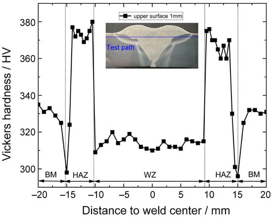 The experiment employed the microhardness tester model TDMH-3 for measurements. The hardness values were measured at intervals of 1 mm along the weld zone and 0.5 mm along the HAZ and the BM. A load of 1 kgf was applied for 15 s during testing. It can be observed that the joint microhardness exhibited a generally symmetrical distribution on both sides of the weld zone, as illustrated in Figure 17. The WZ in the welded joint displayed the lowest and relatively stable microhardness, measuring approximately 314 HV. However, greater variations were observed in the microhardness of the whole HAZ. Specifically, the microhardness of the HAZ adjacent to the WZ sharply increased to a maximum value of 380 HV, while it suddenly decreased to a minimum value of 296 HV closer to the BM. This variation was mainly because the HAZ adjacent to the WZ consisted of coarse grains, particularly the coarse M. As a result, the microhardness increased to the maximum value. Nevertheless, the HAZ adjacent to the base metal was an incomplete quenching region composed of TM and F; therefore, it exhibited the lowest microhardness. Additionally, the microhardness of the BM remained relatively constant at 332 HV.