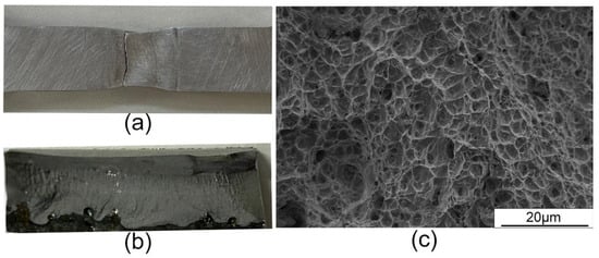 Macroscopic and microscopic-fractured surfaces of HAZ after Charpy impact testing at −40 °C: (a) macroscopic fracture, (b) ductile fracture region, and (c) quasi-cleavage fracture region.