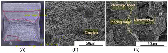 Macroscopic and microscopic-fractured surfaces of WZ after Charpy impact testing at −40 °C: (a) macroscopic fracture, (b) ductile fracture region, and (c) quasi-cleavage fracture region.