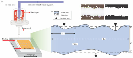 Recently, aerosol jet printing (AJP) technology has risen to prominence as an innovative non-contact direct writing method in advanced manufacturing [1,2,3]. These methods are increasingly preferred over traditional syringe and ink-jet approaches due to their notable benefits [4,5]. AJP, in particular, stands out as it can be with a diverse array of functional inks, expanding its usability and significantly reducing the number of production steps required, thereby reducing chemical waste and lowering production costs [6,7]. As a result, AJP is acknowledged as an environmentally friendly and cost-effective manufacturing solution responsible for substantial progress in the field of printed electronics [8,9]. The adaptability and high resolutions offered by the AJP process are particularly appealing to the aerospace and electronics industries, which require the precise placement of advanced electronic components on compact surfaces with tight spacing patterns. For instance, Liu et al. and Zhao et al. utilized AJP technology to fabricate flexible sensors for diverse applications [10,11], Clifford et al. and Paulsen et al. produced integrated electronic circuits on 3D Structures or thin film with AJP technology [12,13,14], Serpelloni et al. and Cao et al. developed flexible and stable thin-film transistors by means of AJP technology [15,16]. Additionally, AJP shows promise as an AI-enhanced manufacturing method, offering precision, flexibility, and the capability for real-time monitoring, optimization, and quality control through the integration of artificial intelligence [2,17].