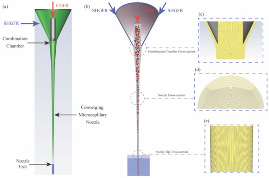 Modeling and mesh generation for the AJP printhead: (a) simplified 3D model of AJP, (b) 3D geometry meshing of the simplified AJP printhead, and mesh demonstration of (c–e) combination chamber, flow transport channel, and nozzle exit, respectively.