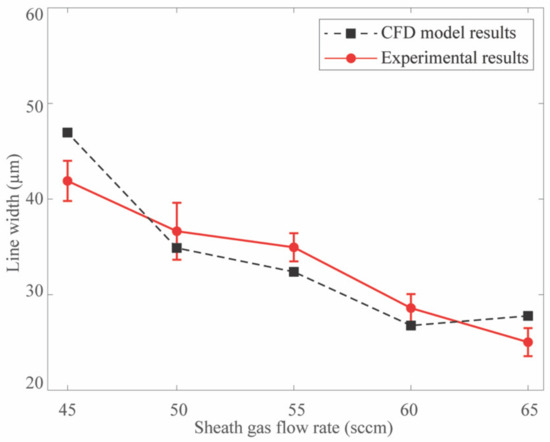 Previous research highlights the substantial aerodynamic interactions induced by the sheath gas flow within the deposition head entering the combination chamber. However, a more in-depth investigation is needed to understand the impact of the SHGFR on the velocity profile and subsequent droplet collimation when the flow exits the nozzle [37]. Therefore, this section explores the influence of varying the SHGFR on velocity profile, droplet collimation, and corresponding line width. Specifically, the SHGFR is adjusted from 45 sccm to 65 sccm in 5 sccm increments. Figure 6 illustrates the impact of SHGFR variations on the printed line width, comparing the experimental data (red solid line) with the numerical prediction outcomes (black dotted line). The obtained results suggest that increasing the SHGFR narrows the line width due to improved particle focusing and collimation in the converging print channel, demonstrating a consistent overall trend with previous research using a 2D CFD model regarding increased SHGFR. On the other hand, the developed CFD model lacks consideration of ink-substrate interactions and droplet behavior, resulting in deviations (less than 20%) from the experimental data. Despite this, the simulation aligns with experimental trends and can compensate for insufficient experimental data.