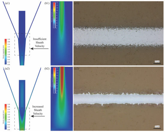 Determining the influence of the CGFR on the aerosol stream width within a print channel, particularly after the stream exits the nozzle where there is no wall confinement, is crucial for understanding particle collimation variations. Figure 5 analyzes the influence of varying the CGFR on the velocity profiles in a CFD-simulated mist tube. Specifically, the comparison between Figure 5a1,a2 demonstrates that a higher CGFR increases the momentum of atomized ink droplets within the tube, further validating the significant interactions between SHGFR and CGFR within the printhead, which is in accordance with previous research using a 2D CFD model. Consequently, Figure 5b1,b2 shows that an increased CGFR results in a wider line width. This occurs because a higher CGFR reduces the relative velocity between the particles and the fluid, diminishing the Saffman force and, thus, broadening the line width. Additionally, increased CGFR boosts the evaporation rate of the droplets, further decreasing their diameter and Saffman force at the nozzle exit. This combined effect allows the aerosol flow to better resist collimation, leading to wider lines at elevated CGFR levels. Figure 5c1,c2 experimentally validate the effects of the CGFR on the deposited line width.