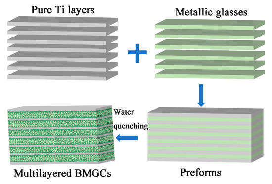 The Ti31.16Zr28.69Ni5.04Cu8.55Be21.56Mo5 (at.%) BMG ingots were prepared by arc melting a mixture of pure elements (purity wt% ≥ 99.9%) under a Ti-gettered high-purity argon atmosphere. The process of preparing bulk metallic glass composites (BMGCs) with layers of varying thickness is shown in Figure 1. The BMG ingots were re-melted at least four times to ensure compositional homogeneity. The metallic glass (MG) ribbons of about 50 μm in thickness and 10 mm in width were produced by a melt spinning method. The commercially pure Ti layers of 50 μm, 80 μm, 100 μm, 150 μm, and 200 μm in thickness were cut into the same dimensions as the MG ribbons. These pure Ti layers and MG ribbons were ultrasonically cleaned in ethanol. The pure Ti layers and MG ribbons with different thicknesses were then alternately stacked to create preforms with a thickness of 10 mm and length of 80 mm. The preparation process of the BMGCs from our previous works was used as the reference [19,20,21,22]. The BMGCs prepared with Ti layers of 50 μm, 80 μm, 100 μm, 150 μm and 200 μm in thickness are denoted as Ti50, Ti80, Ti100, Ti150 and Ti200, respectively.