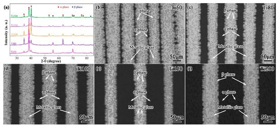 Figure 3a shows the XRD patterns of the as-prepared multilayered BMGCs with various thicknesses of Ti-rich laminates. The XRD patterns demonstrate that these BMGCs are comprised of the α-phase, β-phase, and MG matrix. Figure 3b–f show the SEM images of these BMGCs. Apparently, an alternate distribution with the Ti and glassy layers is observed, conforming to the anticipated designed structure. It can be seen that the residual pure Ti (black) after the dissolution increases in thickness as the thickness of the Ti layer increases, which is highly expected. The α-phase (dark regions) and β-phase (gray regions) are dispersively distributed in the glassy matrix (the remaining bright regions). The interfacial reaction between the reinforcement phase and the glassy matrix has always been a fatal problem for ex situ BMGCs [14,26,27]. However, this defect does not appear in the present multilayered BMGCs. It is evident from Figure 3b–f that there are no porosities and microcracks in the overall cross-section of the multilayered BMGCs, which reveals the relatively well-bonded characteristic that the interfaces between the Ti layers and the glassy matrix obtained during the preparation process. The microstructures of these multilayered BMGCs are also consistent with those of the Ti-based multilayered BMGCs previously reported [20,21].