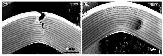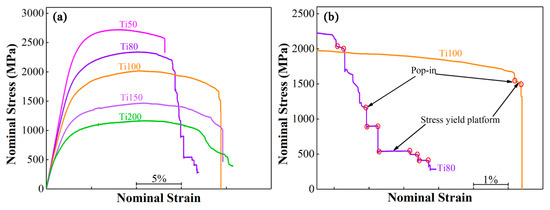 The stress–strain curves under the three-point bending condition are shown in Figure 4a. It is apparent that all the BMGCs exhibit a work-hardening behavior after yielding, followed by a gradual decline in the stress. The yielding strength and ultimate strength are summarized in Table 1 for all the current BMGCs. It is clearly shown that the yielding strength and ultimate strength decrease considerably from 2066 MPa and 2717 MPa for Ti50 to 668 MPa and 1163 MPa for Ti200 as the thickness of the Ti-rich layers increases. Among them, the Ti150 multilayered BMGCs exhibit the most reduction in yield strength and ultimate strength, reaching ~312 MPa and ~372 MPa, respectively, compared with the Ti100 multilayered BMGCs.