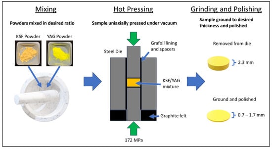 The synthesis procedure for the phosphor ceramics is illustrated in Figure 1. Phosphor powders of K2SiF6:Mn4+ (KSF, Current Chemicals, Cleveland, OH, USA) and Y3Al5O12:Ce3+ (YAG, Intematix, Fremont, CA, USA) were weighed to the desired ratios (1 g in total) and hand-mixed in a mortar without grinding. Samples were produced with YAG loading fractions of 0, 2.5, 4, 5, and 7.5 wt%. Above 7.5 wt% YAG, the samples became too highly scattered to allow sufficient blue light transmission at the thicknesses studied. The concentrations of the dopants Mn and Ce were analyzed by Galbraith Laboratories, Inc. (Knoxville, TN, USA) via inductively coupled plasma optical emission spectroscopy (ICP-OES) and found to be 0.048 wt% and 0.75 wt%, respectively. The phosphor powders were handled in an argon-filled glovebox to prevent the adsorption of water. The mixed powders were loaded into a 12.7 mm diameter steel die lined with pyrolytic graphite foil, which helped prevent the cracking of the sample. The die body was supported by a ring of compressible graphite felt to allow for a more symmetrical densification (also known as dual-action pressing). The die was then loaded into a uniaxial hot press, pressed under vacuum (≤3.0 × 10−3 mTorr) at approximately 172 MPa (25,000 psi) and 300–400 °C, and held for 1 h. The optimal pressing conditions were experimentally determined by varying the temperature and pressure. Above ~400 °C, the samples darkened, and below ~300 °C, the translucency was reduced. The maximum working pressure for the die/hot press was used, as lower pressure resulted in less translucency. The temperature ramp rate was 10 °C/min (upward and downward), and pressure was not applied until the dwell temperature was reached. The pressure was released at the end of the dwelling. The surfaces of the ceramics were polished with a solution of sodium lauryl sulfate, water, and 0.5 μm diamond grit on a soft pad. The densities of the samples were measured using the Archimedes method with water.