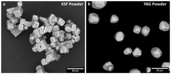 The starting powders of YAG and KSF, imaged via SEM, are shown in Figure 2. The KSF particles are cuboidal and agglomerated, while the YAG particles are roughly spherical and unagglomerated. The average particle sizes of the powders were 10 μm and 13.6 μm for KSF and YAG, respectively, as indicated by the manufacturers and verified via microscopy.