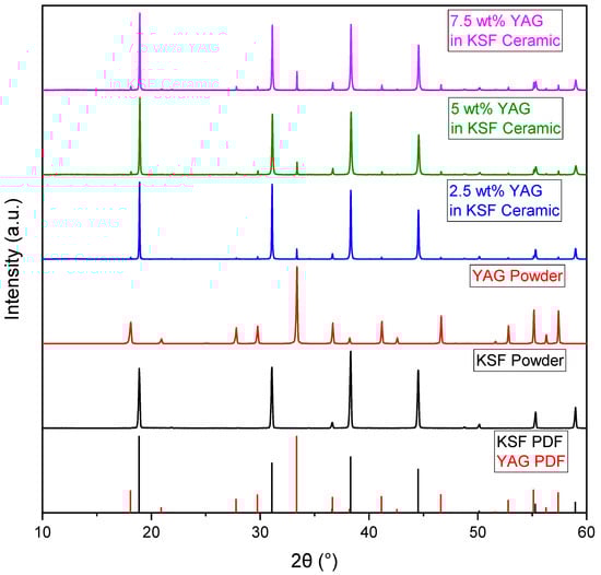 The XRD patterns of the raw phosphor powders and ceramics with various loading fractions of YAG are shown in Figure 3. The raw powders are pure-phase KSF and YAG. As expected, the only phases identified in the ceramics are the cubic KSF and YAG phases, indicating that the hot-pressing conditions do not induce reactions between the constituents and form undesired phases, which would degrade the quantum efficiency or translucency. This is unsurprising given that the hot-pressing temperature is far below the melting point of YAG (1970 °C). Furthermore, there are no reactions with the environmental atmosphere, the steel die, or the graphite foil. The intensities of the peaks also match well with the theoretical values, indicating that there is no preferential grain orientation of KSF or YAG. The densities of the 0, 2.5, 4, 5, and 7.5 wt% YAG samples were measured at 2.70, 2.72, 2.73, 2.73, and 2.76 g/cm3, respectively. Since YAG has a higher density than the pure-KSF ceramic, an increasing trend in density with the YAG loading fraction is expected. The theoretical densities of the samples based on the volume fractions of YAG and KSF, using 4.560 g/cm3 and 2.700 g/cm3 for pure YAG and KSF, respectively, are 2.700, 2.728, 2.745, 2.756, and 2.785 g/cm3 (in the same order). The measured densities of the composite ceramics are less than 1% lower than the theoretical densities. This small discrepancy may be due to the accuracy of the measurement, or possibly to the YAG particles introducing a small amount of porosity, which lowers the density slightly.