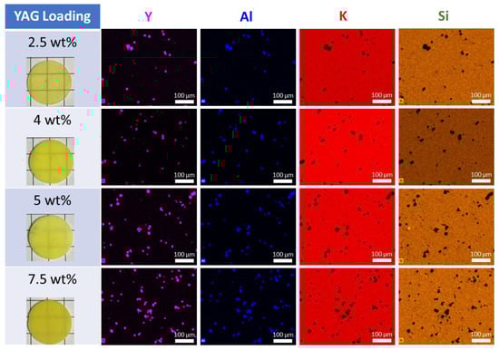Energy-dispersive X-ray spectroscopy maps of the polished surfaces of samples with 2.5, 4, 5, and 7.5 wt% YAG loading fractions (pictures of samples at left).