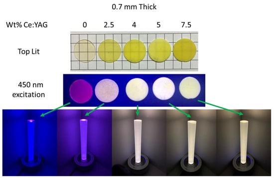 Photographs of the samples are shown in Figure 6. The translucency of the samples decreases with an increasing YAG loading fraction due to increased scatter. The samples were excited on one side with a blue LED, and a diffuse light rod was placed on top to view the emitted light (bottom of Figure 6). The light color scattering out of the rod changes as a function of the YAG loading fraction and sample thickness. The images in Figure 6 were all taken at a sample thickness of 0.7 mm. The light is blue for the sample without YAG, since most of the LED light is transmitted due to the low Mn concentration and thin sample. At 2.5 wt% YAG, the light becomes purple due to the yellow light contributed by the YAG particles and a longer path length for the blue light, caused by increased scatter, leading to less transmitted blue light. At 4 wt% YAG, white light is achieved, and at 5 and 7.5 wt% YAG, the white light becomes warmer.