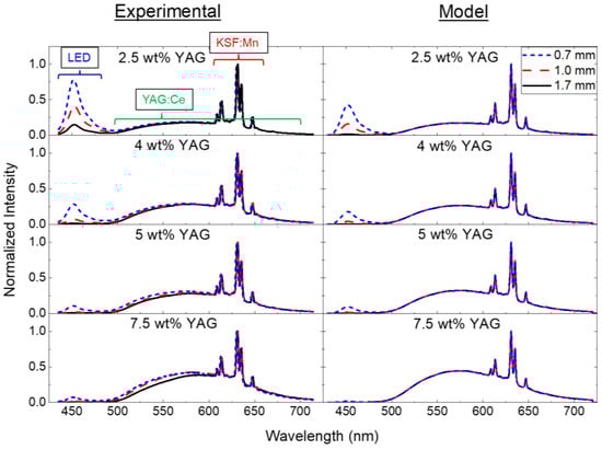 Experimental and modeled emission spectra of the samples excited by a blue LED with various YAG loading fractions at different thicknesses. The spectral contributions attributed to the LED, YAG:Ce, and KSF:Mn are labeled in the top left panel.