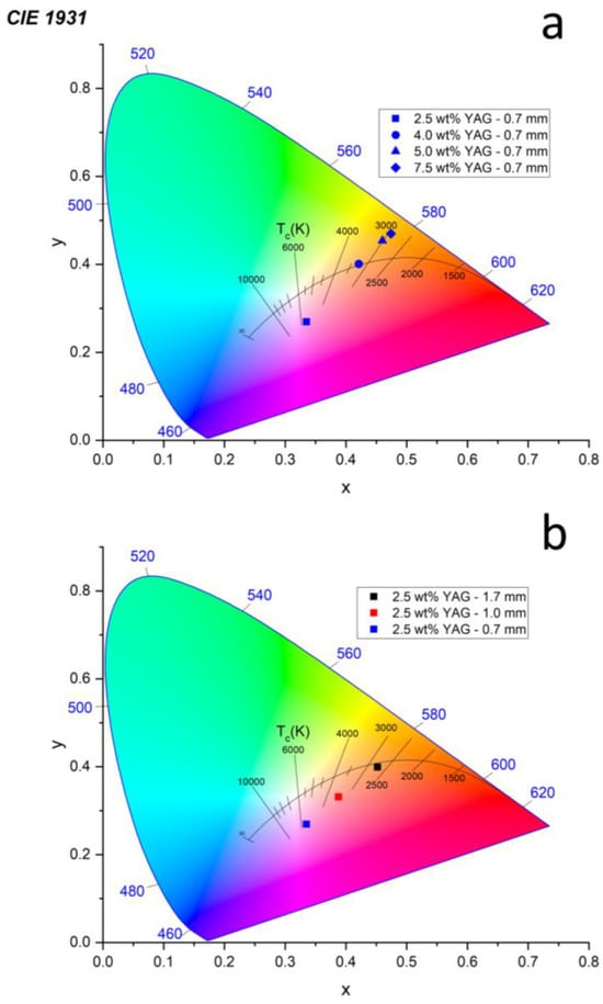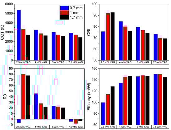Two subsets of samples are plotted on CIE color coordinate graphs in Figure 8, and the values of the correlated color temperature (CCT), the color rendering index (CRI), R9, and the estimated efficacy of all samples, obtained using the spreadsheet developed by Li and Luo [24], are shown in Figure 9. The color temperature decreases from about 6000 K to 3000 K with an increase in the YAG loading fraction from 2.5 to 7.5 wt% (Figure 8a) due to decreased blue light transmission and greater YAG emission. Likewise, the color temperature also decreases with increasing sample thickness (Figure 8b) due to decreased blue light transmission. Two samples are close to the blackbody radiation curve: 2.5 wt% YAG—1.7 mm (CCT = 2716 K, x = 0.452, y = 0.399) and 4 wt% YAG—0.7 mm (CCT = 3258 K, x = 0.421, y = 0.401). For reference, the CIE coordinates for a standard tungsten filament bulb with a CCT of 2856 K are x = 0.4476 and y = 0.4074 [25], which are close to the values for the aforementioned samples. All other samples either have too much or too little blue light transmission to fit directly on the blackbody curve. Several samples have desirable CRI (>80) and R9 (>20) values. The estimated efficacy tends to increase with the YAG loading fraction due to human eye sensitivity peaking in the green. Table 3 compiles the CCT, CRI, R9, estimated efficacy, and CIE color coordinates of all the samples.