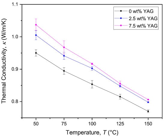 The thermal diffusivity of the composites was measured as a function of temperature for various loading fractions of YAG (Figure 10). As expected, the thermal conductivity increases alongside an increase in constituent YAG [26], with the greatest impact (a 9% increase for 7.5 wt% YAG) seen at around 50 °C. At higher temperatures, increased constituent YAG in the composition has a diminishing effect due to solute-atom scattering being less impactful in comparison to intrinsic phonon scattering, which scales with temperature [27]. The thermal conductivity of the pure KSF decreases to 0.77 W/m-K at 150 °C, in contrast to our previously reported value of 1.05 W/m-K at 200 °C [21]. This new value is believed to be more accurate since the thermal conductivity is expected to be inversely correlated with temperature in an insulating material.