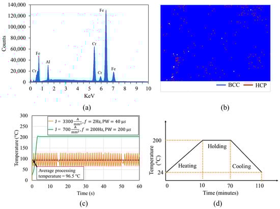 (a) Energy dispersive X-ray (EDX) spectrum of materials; (b) EBSD phase map of alloy (white dots are points of zero solution); (c,d) temperature profile during (c) various EWF-assisted annealing and (d) thermal annealing for benchmarking purpose.