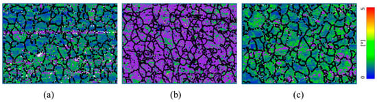 Grain boundaries and kernel average misorientation maps for (a) pristine, (b) ~25% rolled and (c) EWF-annealed at ~100 °C. The color scale from 0° to 5° represents KAM values, with violet indicating low-angle grain boundaries (LAGBs) defined within the range of 2° ≤ θ ≤ 10°, and black color indicates high angle grain boundaries (HAGBs) (θ > 10°).