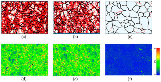 Grain boundaries (a–c) and kernel average misorientation (KAM) maps (d–f) of (a,d) ~50% rolled; (b,e) EWF annealed at ~100 °C with current density of ; (c,f) EWF annealed at ~200 °C with current density of Red color in panels (a–c) indicates low-angle grain boundaries (LAGBs) (2° ≤ θ ≤ 10°) and the black color indicates the HAGBs (10° < θ ≤ 100°). The color scale in panels (d–f) displays the misorientation angles from 0° to 5°.