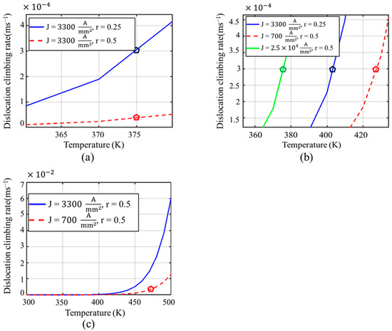 (a–c) Dislocation climbing rate for various annealing conditions (J is the current density, r = 0.25 and 0.5 represent 25% and 50% rolling, respectively).