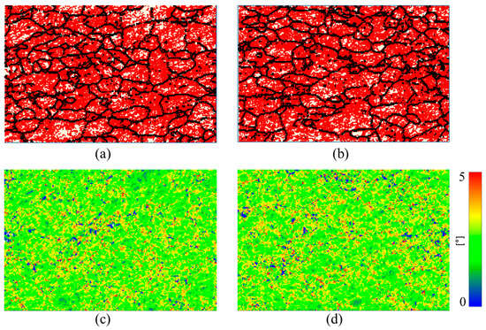Grain boundaries (a,b) and kernel average misorientation (KAM) maps (c,d) of (a,c) ~50% rolled; (b,d) thermal annealed at ~200 °C for 110 min. In panel (a,b) Red color indicates low-angle grain boundaries (LAGBs) (2° ≤ θ ≤ 10°) and black color indicates high angle grain boundaries (HAGBs) (θ > 10°). The color scale in panels (c,d) displays the misorientation angles from 0° to 5°.