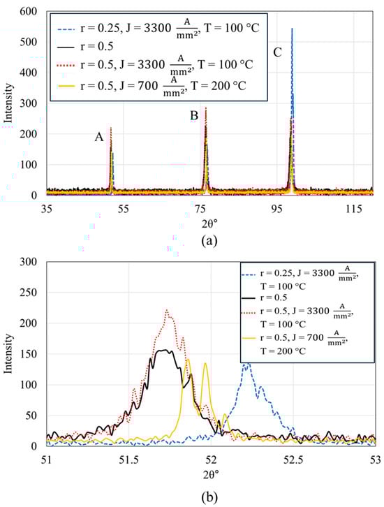 The comprehensive X-ray diffraction (XRD) analysis details the microstructural changes in a FeCrAl alloy subjected to mechanical rolling and subsequent electron wind force (EWF)-assisted annealing. In the pristine FeCrAl sample, three major peaks are identified, denoted as Peak A, Peak B, and Peak C, as shown in Figure 6. The analyses of peak position shifts and changes in full width at half maximum (FWHM) induced by mechanical deformation and subsequent annealing processes are detailed in Table 2 and Table 3, respectively. Upon rolling to 25%, a subtle leftward shift in the peak positions to lower 2θ values and significant increase in the full width at half maximum (FWHM) are observed, which indicates the introduction of dislocations and residual stresses causing lattice strain [46]. In our previous research [30], we demonstrated that EWF-assisted annealing at 100 °C with a current density of effectively reduced the FWHM close to the pristine value. However, when the rolling is intensified to 50%, the peak positions exhibit a more pronounced leftward shift (for instance, peak A shift ~0.53° leftward). Correspondingly, the FWHM of each peak increases more significantly for the 50% rolled sample, indicating a greater accumulation of internal stresses and defects [47,48]. After EWF-assisted annealing at a current density of and a temperature of 100 °C, the peaks exhibit negligible movement (see Figure 6b–d), suggesting minimal stress relaxation or defect recovery under these conditions. Similarly, under this initial EWF treatment conditions ( at 100 °C), only a slight modification in the FWHM values is observed. This indicates that under these conditions, the EWF treatment does not significantly reduce the dislocation density or relax the lattice strains induced by 50% rolling. Conversely, when the treatment involves a lower current density () but at a higher temperature (200 °C), the peaks shift rightward, approaching the positions observed in the pristine state. This indicates a substantial reduction in lattice strain and dislocation density, suggesting effective defect mitigation.