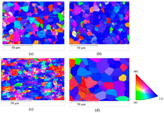 The Electron Backscatter Diffraction (EBSD) maps represent different stages of treatment for a FeCrAl alloy: (a) pristine (b) after being 50% rolled, (c) after thermal annealing at 200 °C, and (d) after undergoing EWF-assisted annealing at 200 °C.