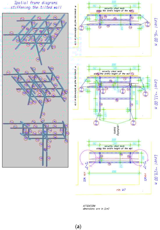 The idea behind this solution was to capture the damaged wall at three levels and protect it against loss of stability by anchoring it to a wall where stability and load-bearing capacity were beyond doubt. The project assumed the possibility of fragments of the wall breaking off in the highest part of the wall and the possibility of them falling to the lowest level, hence the designed steel structure was secured with a steel mesh. This solution took into account the low-strength class of bricks and mortars, their deep losses, and the lack of proper bonds between the masonry elements. In the proposed solution, platforms made of 25 mm thick OSB (Oriented Stand Board) boards were introduced on two levels, the task of which was to dampen the impact of falling debris on two levels, assuming the possibility of their subsequent destruction (starting from the first and then the second platform) in the event of the disaster of the wall in question. The principle of local strengthening of the above-mentioned chimney wall is shown in Figure 11, which was to involve injecting gaps in the joints between the bricks and strengthening the cracked and bulging parts of the walls with composite meshes (FRCM). The use of carbon meshes applied on mineral matrices did not take away from the authentic appearance of the monument because, in the past, its walls were entirely covered with plaster.
