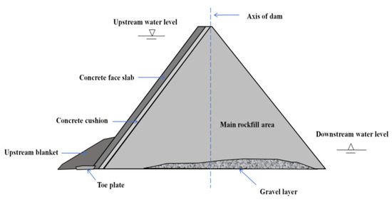 Earth–rockfill dams are the fastest growing type in dam construction worldwide. It is widely used and developed because of its high economy, ability to be made with local materials, and suitability for all kinds of operating conditions. The concrete-face rockfill dam uses the concrete face on the upstream surface as the anti-seepage structure, as shown in Figure 1. As an earth–rock dam, it has been commonly used because of its good permeability, seismic performance, and slope stability [1]. Micro-cracks are produced in the face dam with water pressure, freeze–thaw, carbonization, and other intervention methods [2]. Traditional crack repair methods, such as the surface repair, grouting, and filling methods, are suitable for cracks with small depths [3], and the grouting and filling methods are suitable for deep cracks, but the grouting material pollutes the environment [4,5]. The repair method of an impermeable wall can be adopted for deep and significant cracks, but the cost is high, it takes a long time, and the construction process has certain risks. Although the above-mentioned crack repair methods have been applied, each method still has certain problems. Therefore, it is necessary to develop an efficient and environmentally friendly concrete crack repair method in laboratory research and ultimately use it in on-site crack repair experiments.