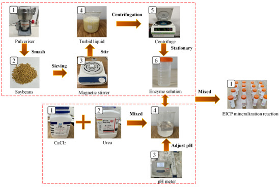 Fresh soybeans were crushed for 5 to 10 min in an 800 A crusher (manufactured by Yongkang Jinwei Electric Appliance Co., Ltd., Yongkang, China) and filtered using a 100-mesh sieve to collect soybean powder. Soybean flour was added to deionized water, stirred with an SN-MS-1 magnetic stirrer (manufactured by Xi’an KTL Instruments Co., Ltd., Xi’an, China) for 1 h, and kept still for 24 h. Then, the solution was placed into a TGL-16G centrifuge (manufactured by Hunan Kecheng Instrument and Equipment Co., Ltd., Changsha, China) and centrifuged for 15 min at 4 °C and 3000 r/min to extract the supernatant solution and obtain the enzyme solution. Calcium chloride and a urea solution were used to prepare the cementing fluid. The pH values of the two solutions were adjusted with a pH meter, and the crystal form was stabilized by adding skim milk powder. The enzyme solution was mixed with the cement solution and catalyzed the hydrolysis of urea in the cement solution to obtain carbonate and ammonium ions. The calcium ions in the cement solution reacted with the hydrolyzed carbonate ions to form calcium carbonate precipitates, which were used for repairing mortar cracks. Previous experiments considered the effects of the incorporation ratio and concentration of the enzyme solution, pH value, and the content of skim milk powder on the EICP reaction rate. Previously, tube tests were used to obtain the optimal EICP mineralization reaction conditions and consider the effects of the incorporation ratio and concentration of the enzyme solution, pH value, and the content of skim milk powder on the EICP reaction rate. Tube tests obtained the following optimal factors: an enzyme solution concentration of 100 g/L; a cement fluid concentration of 1.0 mol/L; a skim milk powder content of 6 g/L; a pH of 7.0; and an enzyme incorporation ratio of 0.1 (see Appendix A). Figure 3 shows the preparation processes of the enzyme and cement solutions.