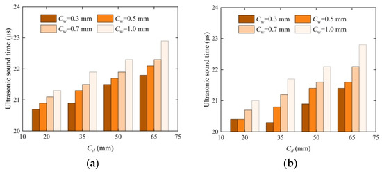 Ultrasonic crack detection technology can reflect the repair effect of concrete cracks to a certain extent. Figure 4 shows a histogram of the ultrasonic sound time changing with depth before and after the concrete repair of four crack widths. The ultrasonic acoustic time value of the cracked test block is higher than the nondestructive test block, the ultrasonic sound time of the test concrete specimen repaired using EICP is reduced, and the peak diffuse transmission time is slower than that of the unrepaired test block, as shown in Figure 4. As the crack width increases, the loss of ultrasonic sound time is significant, which is consistent with the reference research. As the fracture depth increases, the acoustic time loss of the crack block increases. Among them, the average losses of the acoustic time values of 20 mm and 65 mm crack depth are smaller and larger, respectively. As the crack depth increased, the loss rate of the acoustic time value gradually increased. At a crack width of 0.3 mm, the ultrasonic sound time at a crack depth of 20 mm is 20.3 μs, and the ultrasonic sound time at a crack depth of 65 mm is 21.4 μs. According to Formula (1), the loss rate of the measured ultrasonic sound time (r1) is 5%, which is not significantly different from the 0.5 mm crack width. The maximum loss rate of sound time at a crack width of 1.0 mm is 8%. Among all test blocks, the minimum loss rate of acoustic time value is 1.5% at a crack depth of 35 mm and a width of 0.3 mm. In a specimen with a 1.0 mm width, the average loss rate is between 5% and 13% at different depths, and the maximum loss rate is 13% at a depth of 65 mm. The main reason for the above phenomenon is that after repairing concrete with different crack widths via EICP injection, the precipitates adhere to the crack surface. Quartz sand has a coarse surface, which can improve the internal filling effect as a repair medium. The loss rate of the sound time value with a smaller crack width is better than that with a larger crack width. As the crack depth increased, the internal defects increased, and the distance of ultrasonic acoustic emission grew longer.