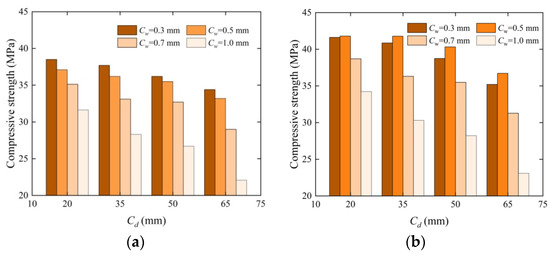 Compressive strength has an excellent characterization effect on the internal defects of concrete [24], which can reflect the repair effect of EICP on concrete. Figure 5 shows the sample image of the compression test. Figure 6 shows a histogram of the compressive strength and crack depth of concrete specimens under four crack widths, and Figure 7 shows a histogram of compressive strength loss rate and recovery rate changing with crack depth under four crack widths. These figures show that after the compression test, the upper boundary of the concrete test block is covered with a large amount of white material on the surface, including quartz sand and calcium carbonate. As the crack width and depth increased, the compressive strength decreased. The average strength loss rate of the specimen with a 0.3 mm width is the lowest, and the minimum quality loss rate of concrete specimens under a crack depth of 20 mm is 10.05%, which is only 0.38~0.75 times higher than the strength loss of other specimens and has little difference from the strength loss rate of the specimen with a 0.5 mm width and different crack depths. The average loss rate of compressive strength of the specimen with a 1.0 mm crack width is the highest, and the maximum compressive strength loss rate for a crack depth of 65 mm is 48.48%, which is 4.82 times the strength loss of the specimen with the smallest width. The compressive strength of concrete blocks repaired using EICP is significantly higher than that of unrepaired concrete blocks. The highest recovery rate of compressive strength of a 0.3 mm width specimen is 98.41%, and the lowest recovery rate of compressive strength of a 1.0 mm width specimen is 53.93%. This is consistent with the results of ultrasonic testing because the cracks treated using EICP were attached and wrapped due to calcium carbonate precipitation, like a new “skin” on the crack surface. Quartz sand, as a repair medium, is combined with EICP, which improves the compressive strength and reflects the feasibility of EICP to repair concrete more intuitively. As the crack width and depth increased, the “skin” gradually expanded, the calcium carbonate generated in the test sample was loose, and its cementing performance was not fully displayed, so the test concrete specimen was more prone to compression damage.