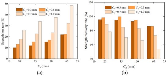 Histogram of strength loss and recovery rates of specimens with different crack widths before and after repair as a function of crack depth: (a) unrepaired and (b) repaired test blocks.