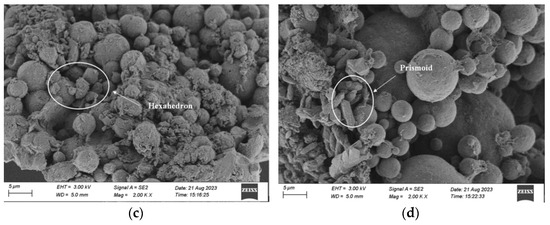 Figure 11 shows the microstructure diagram of the EICP-repaired concrete block with four crack widths. As shown in the graph, the calcium carbonate crystals generated via EICP are distributed inside the cracks, and the calcium carbonate crystals with crack widths of 0.3 mm and 0.5 mm are mainly spherical. From the above analysis, we concluded that the spherical crystals were vaterite. The distribution of calcium carbonate crystals is uniform under crack widths of 0.3 mm and 0.5 mm. Adjacent particles become whole via cementation and adsorption, and the contact between particles is surface contact. The surface roughness of concrete and calcium carbonate crystals increased by including the quartz sand repair medium, and their cohesion improved. The surface of large crystal particles was covered with fine crystals, and the crystal structure was close. At crack widths of 0.7 mm and 1.0 mm, there were not only vaterite but also incomplete hexahedral and prismatic crystals. The distribution of the calcium carbonate formed on the crack surface was uneven, and their cementation and adsorption were low. The results indicate that the formation rate of the calcium carbonate precipitate was affected by the higher crack width, which leads to different crystal shapes and uneven internal dispersion. Therefore, we concluded that the calcium carbonate precipitate can be absorbed by using quartz sand as a repair medium and employing the EICP repair method, and the injection method can make the repair solution enter the crack more smoothly without blocking the surface, making the formed calcium carbonate crystals tightly and uniformly adhere to the cracks, thereby achieving the repair effect of concrete cracks. Overall, EICP technology is promising for research on concrete crack repair.