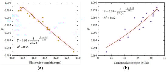 Equation (10) is fitted with the parameters of ultrasonic sound time and compressive strength obtained from the above tests, and the relationship curve between the ultrasonic sound time, compressive strength, and crack repair rate is shown in Figure 12. As shown in the figure, as the crack repair rate increases, there is a negative correlation between ultrasonic sound time and compressive strength, i.e., it will decrease, and the compressive strength will gradually increase, which is consistent with the above analysis. The fitting curves obtained using the probability density function of the Laplace distribution are in good agreement with the ultrasonic time and compressive strength measured in the experiments, in which the fitting degree R2 of ultrasonic time and compressive strength is 0.95 and 0.82, respectively. Therefore, we concluded that our Laplace distribution probability density model has good applicability and can accurately simulate the variation in the ultrasonic sound time and compressive strength of concrete repaired using EICP with a crack repair rate. However, the deviation in individual test data was caused by the non-uniformity of EICP concrete crack repair, which led to internal and strength deviations in the ultrasonic testing concrete crack test block. This may also be caused by the change in internal pores that may occur during concrete test block vibration.