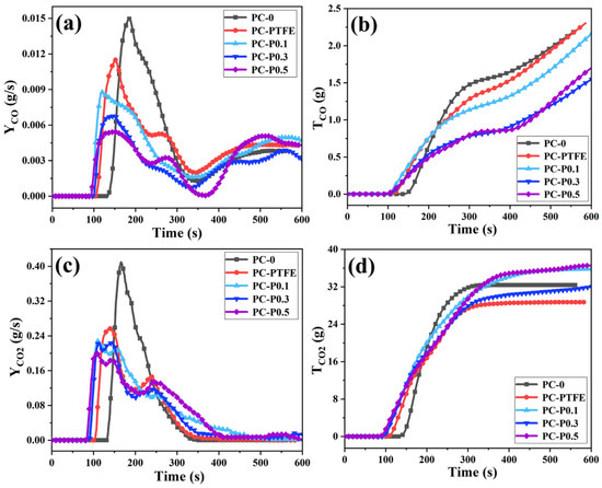 The toxic gases produced by polymer materials in the combustion process are mainly CO and CO2. Therefore, the release rate (YCO, YCO2) and total release amount (TCO, TCO2) of the two gases were collected, and their changing trends are shown in Figure 3. Although the initial release time of CO is advanced, as the amount of PC-FR added increases (0.1 wt%, 0.3 wt% and 0.5 wt%), its peak release rate (PCO) gradually decreases, (deceasing by 41.30%, 54.75% and 63.65%). The TCO of PC-P0.3 is 1.406 g/s, which is 30.61% lower than that of pure sample. In addition to CO release, the addition of PC-FR is found to considerably reduce the CO2 production of PC during burning. The peak CO2 release rate (PCO2) is inhibited, and it appears a double peak, while the TCO2 of all the samples with Pc-FR is significantly higher than that of PC-PTFE and even exceeds the pure PC. This phenomenon may be attributed to the decomposition of the char layer caused by Pc-FR.