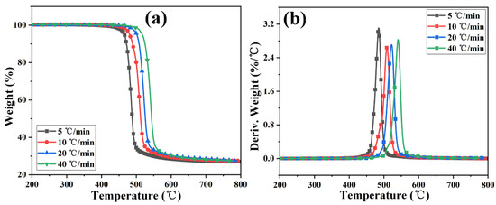 (a) TGA and (b) DTG curves of PC-P0.3 at different heating rates.