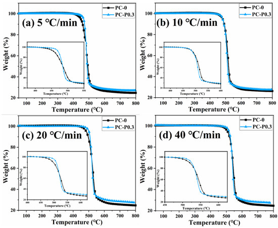TGA curves of PC and PC-P0.3 at heating rates of (a) 5 °C/min, (b) 10 °C/min, (c) 20 °C/min and (d) 40 °C/min.