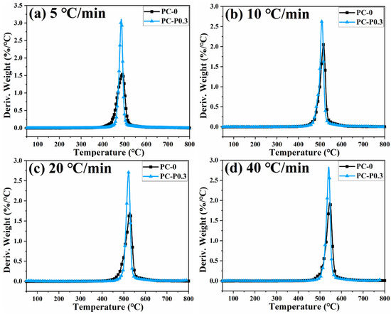 DTG curves of PC and PC-P0.3 at heating rates of (a) 5 °C/min, (b) 10 °C/min, (c) 20 °C/min and (d) 40 °C/min.