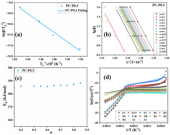 (a) Fitting curve of PC-P0.3 based on Kissinger method. (b) Fitting curve of PC-P0.3 based on F-W-O method. (c) Activation energy of PC-P0.3 at different conversion rates in F-W-O method. (d) Fitting curve of PC-P0.3 based on DAEM method.
