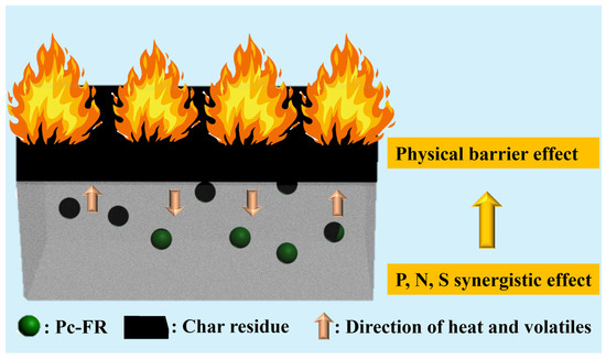 In Figure 7a and Figure S4a and Table S1, the activation energy obtained by the Kissinger method is PC-0 > PC-P0.3. The Ek of both PC-0 and PC-P0.3 is around 181 kJ/mol, proving that Pc-FR has no significant effect on the pyrolysis reaction of the PC. The F-W-O method fitting curves of PC and PC-P0.3 are shown in Figure 7b and Figure S4b. When α was set to 0.1, 0.2, 0.3, 0.4, 0.5, 0.55, 0.6, 0.65, 0.7, 0.75, 0.8, 0.85, 0.9 and 0.95, the corresponding T values of the PC with different β values were taken, and linear fitting was carried out. The relationship between the Ek value and α is shown in Figure 7c and Figure S4c. Relevant data are listed in Table S2. The increase in conversion rate has little effect on the activation energy of the pyrolysis reaction of the PC-P0.3, and its Ek value only fluctuates around 186.45 kJ/mol. Combined with the analysis of the flame retardant mechanism, it can be seen that although the dominant flame retardant role of Pc-FR changes from the gas phase to the condensed phase, the two flame retardant mechanisms are always relatively coordinated during this process, and the effect of inhibiting the thermal decomposition of PC is stable. Therefore, the pyrolysis activation energy of the sample can still maintain at a high level at different conversion rates. Selecting G (α) in Table S3 one by one, performing mathematical processing on the thermogravimetric data of PC and PC-P0.3 (β is 10 °C/min) and making ln[G (α)/T^2] pair and performing data fitting. The results are shown in Figure 7d and Figure S4d. The correlation coefficient R’ values obtained by fitting PC and PC-P0.3 according to different pyrolysis mechanism functions G (α) are recorded in Table S4. The closer the R’ value is to 1, the better the fitting effect is. The pyrolysis mechanism of PC and its composite is stochastic nucleation and subsequent growth, and both meet the Aevrami–Erofeev (A2) equation, and the reaction order is 1/2. The activation energy of the sample is: PC-P0.3 > PC-0. Pc-FR can increase the Ek of the PC by 12.8 kJ/mol, significantly enhancing the thermal stability of the PC matrix. The detailed flame-retardant mechanism of Pc-FR is shown in Figure 8. The Pc-FR combines the characteristic of sulfonate flame retardants and phosphazenes. The N and S elements can play a synergistic effect with the P element of Pc-FR in the condensed phase, resulting in an enhanced physical barrier effect of char residue. Thus, the flame retardancy of PC is enhanced.